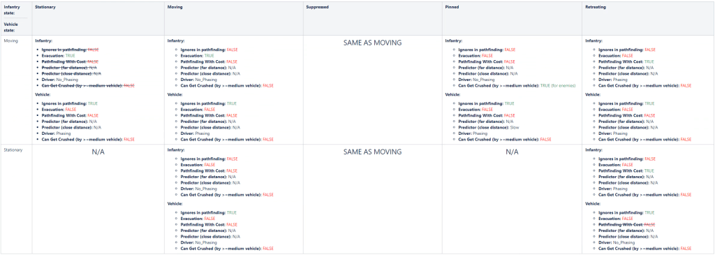 Solution: Design and implement a set of rules that vehicles and infantry must follow, this meant adjusting how different elements of the game perceive each other inside the pathfinding. Infantry entities will still consider each other although at a reduced pathfinding cost, vehicles will ignore infantry alltogether.